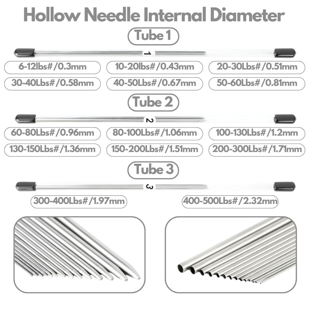 Este kit de 23 piezas incluye Agujas Huecas, Agujas con alambre para hacer lazos y Agujas de Enganche en múltiples tamaños. Disponibles en longitudes estándar de 6 pulgadas y extralargas de 10 pulgadas, estas agujas están diseñadas para empalmes precisos de líneas que van desde 6 lb hasta 1000 lb de resistencia, siendo ideales para todo los armados como Wind on Leaders, empalmes de Monofilamento a Braided Hollow Core y Bridles para Planers. Construcción de Acero Inoxidable: Fabricadas con acero inoxidable de grado médico para una durabilidad excepcional y resistencia a la corrosión, garantizando un rendimiento confiable y un uso prolongado en todas las aplicaciones de armado. Agujas Huecas: Diseñadas para enhebrar y empalmar líneas trenzadas de núcleo hueco, permiten insertar líderes de monofilamento o fluorocarbono de forma fluida, creando una conexión fuerte sin nudos. Los diferentes diámetros se adaptan a distintos calibres de línea para la elaboración de líderes wind-on personalizados y top shots. Agujas para Hacer Lazos de Alambre: Diseñadas para facilitar la creación de lazos y empalmes inversos en líneas de núcleo hueco con gran precisión. Son herramientas clave para fabricar líderes wind-on y otras aplicaciones avanzadas de armado. Agujas de Enganche: Las agujas de enganche retráctiles con gancho son otra opción para formar lazos, realizar empalmes inversos o unir líneas de núcleo hueco entre sí.