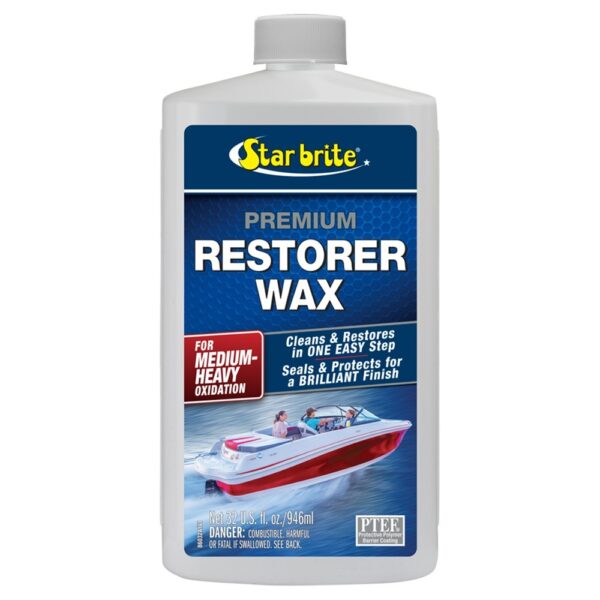 INSTRUCCIONES: Agite bien la botella antes de usar. Aplique el producto uniformemente en un movimiento circular superpuesto con un paño limpio en un área pequeña. Frote bien para eliminar la tiza, la oxidación y las manchas mientras el pulido está húmedo. La cera restauradora Star brite Premium se secará rápidamente hasta formar una neblina. Limpie la bruma resultante con una toalla o paño limpio y seco.