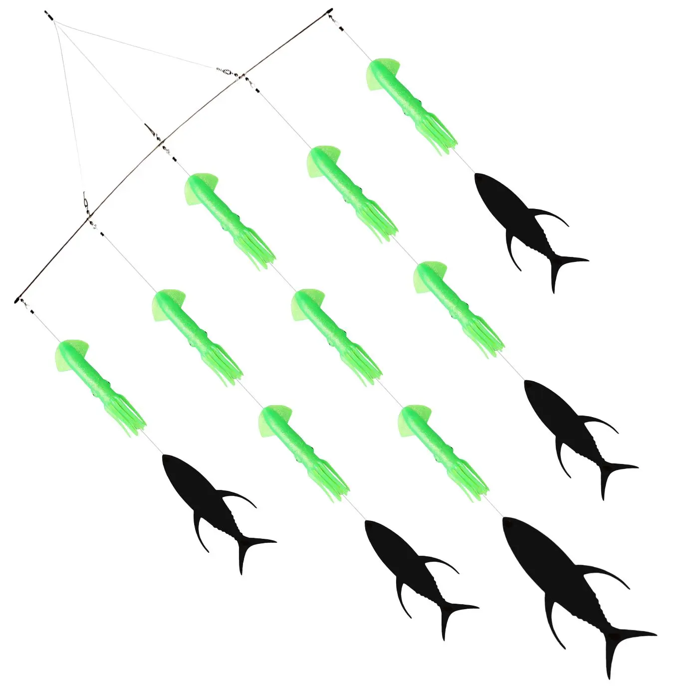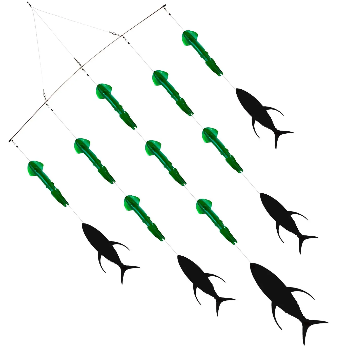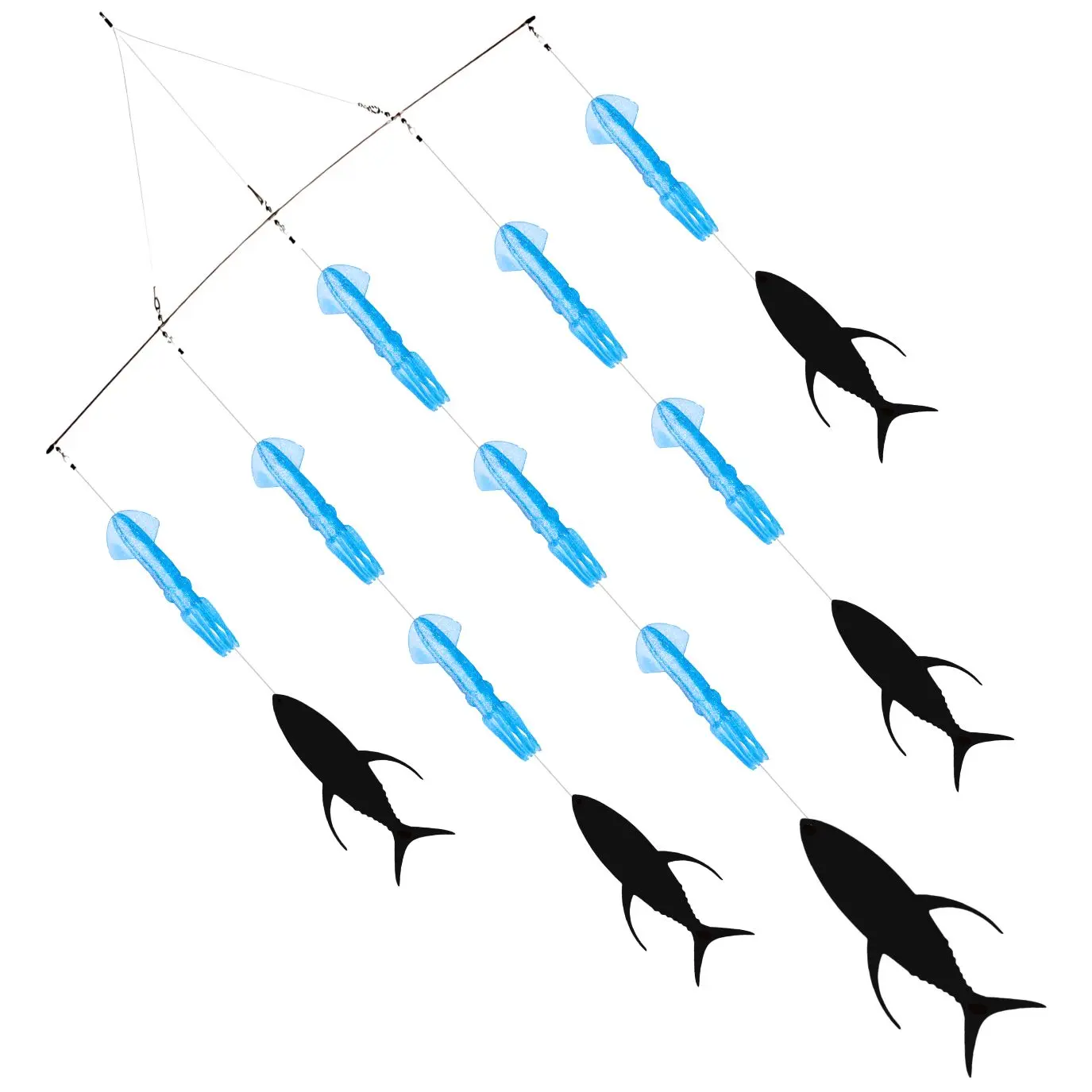 El Bills N Fins Spreader Bar 9 Squids 4 Tuna Flap es una herramienta de alto rendimiento diseñada para aumentar la efectividad en la pesca offshore. Este armado combina nueve calamares artificiales con cuatro Tuna Flaps, creando la ilusión de un cardumen en fuga, lo que provoca la reacción inmediata de los depredadores pelágicos.Los calamares, fabricados con materiales duraderos y realistas, producen destellos y movimiento natural bajo el agua, mientras que los Tuna Flaps aportan vibración y una silueta llamativa que resalta en la superficie. Juntos generan un espectáculo visual que despierta el instinto cazador de especies como marlín, pez vela, atún, dorado y wahoo.