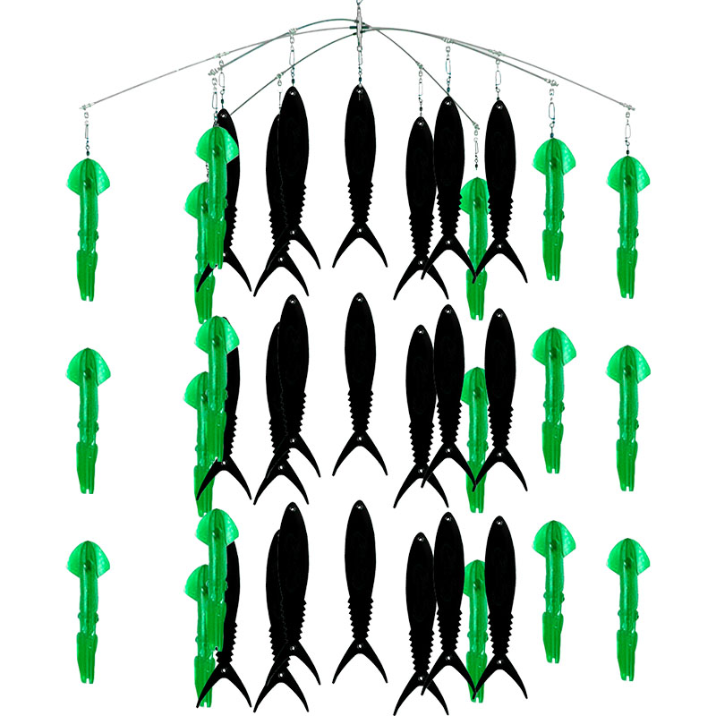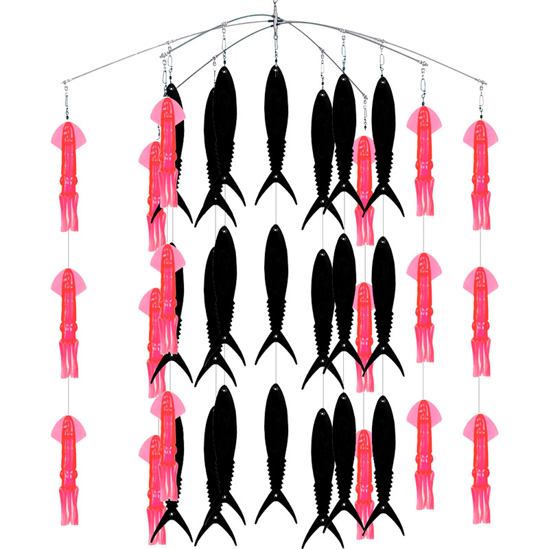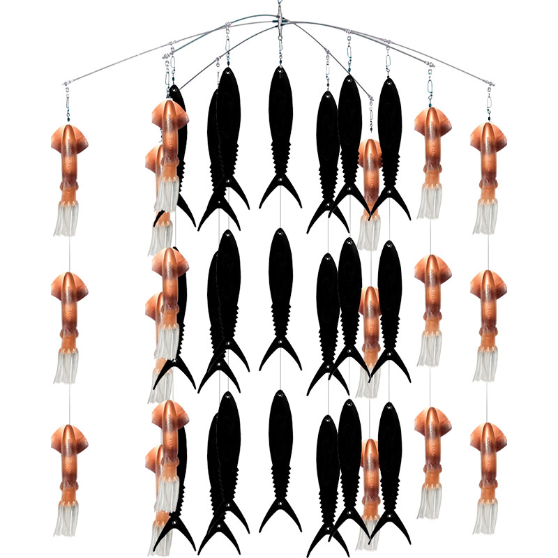 Este dredge está armado con Mack Flaps de 12” en el interior y calamares de 9” en el exterior, simulando así una escuela de sierras separando y atacando una escuela de calamares. A pesar de su tamaño, este dredge es muy ligero y se recomienda para todo tipo de embarcaciones