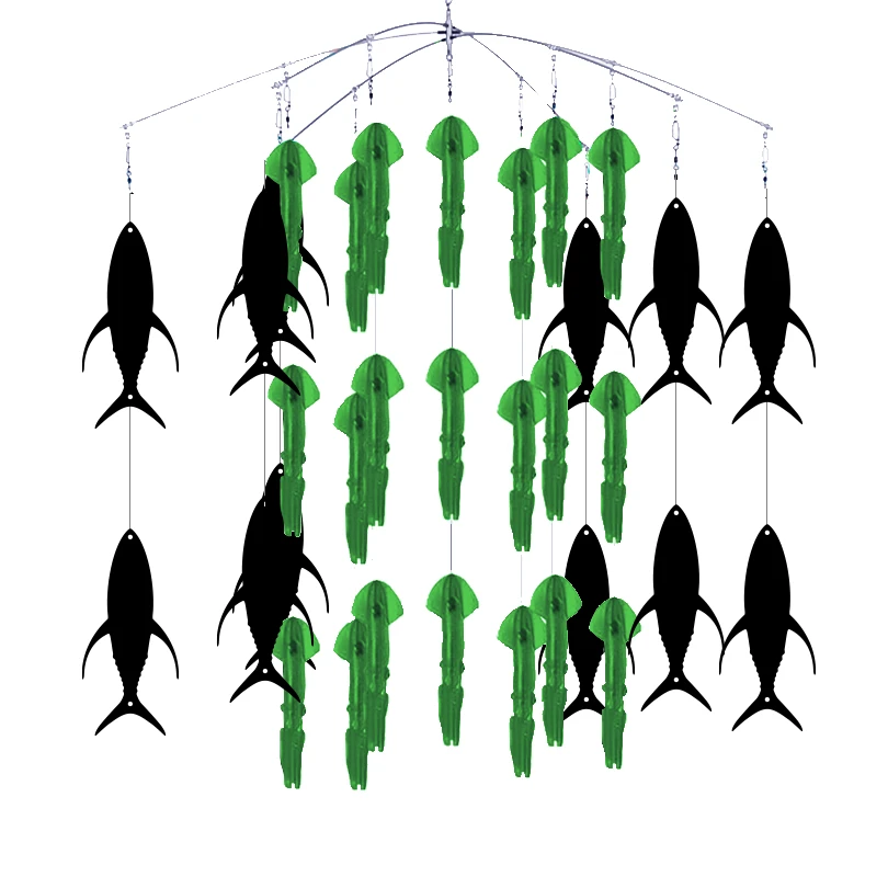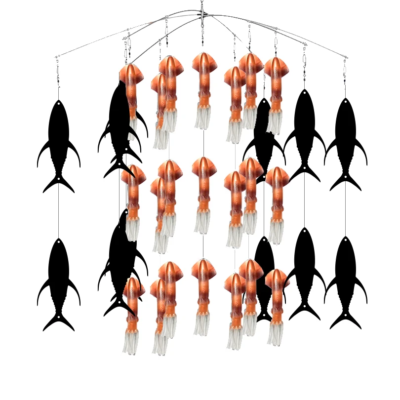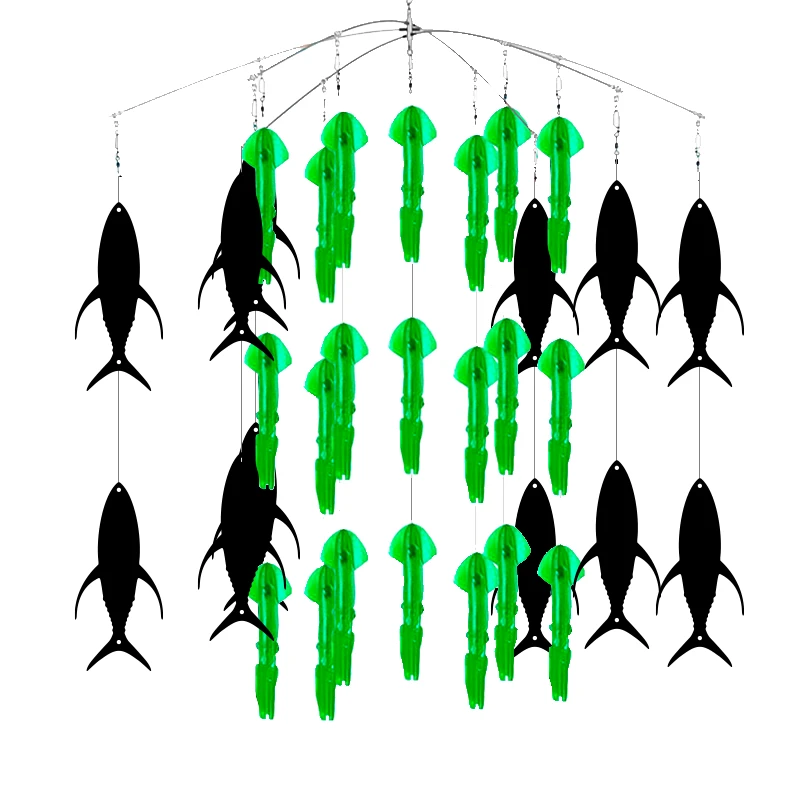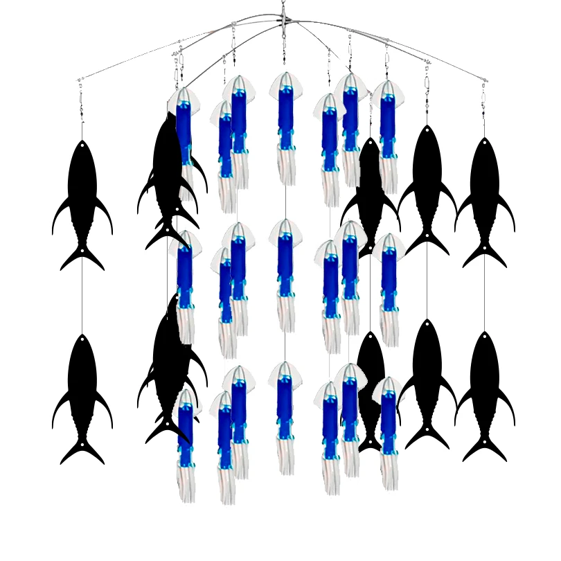 Esta fusión de llamadores ha sido muy efectiva en lugares como Costa Rica, Puerto Rico y Bahamas. Este dredge simula una escuela de calamares defendiéndose del ataque de pequeños atunes a su alrededor, creando así una cadena alimenticia que los picudos no se podrán resistir.